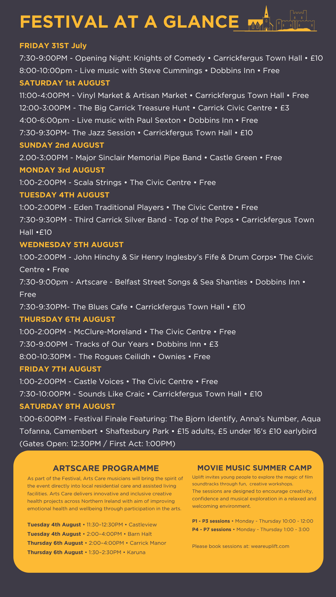 Around The Town loves local – we can’t be more clear than that. Local people in local places, having a great time and loving where we live is what ATT is all about. In 2024 we created a festival week where there’s a platform for musicians, artists, performers and production crew who live in Carrickfergus – no more talent leaving town just to be seen and heard.